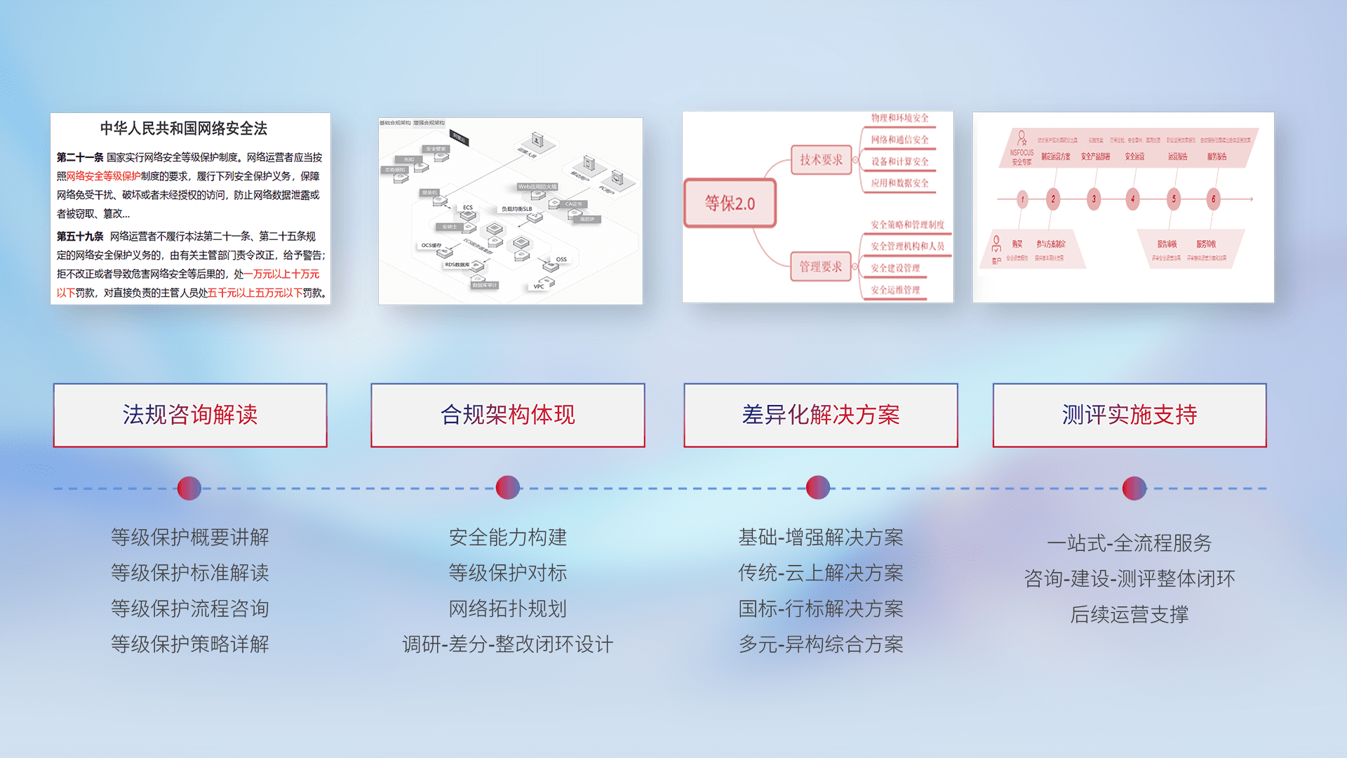 通过专业的法律咨询解读、、、、合规架构体现、、、、差异化解决方案、、测试实施支持等服务,,,,为客户量身打造等保合规体系。。。